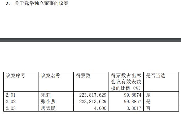 在独立董事的选举中,宋莉、张小燕得票数占比分别为99.8874%及99.8857%,双双入选,房崇民得票数4000,占出席会议有效表决权的比例0.0017%,未能当选。