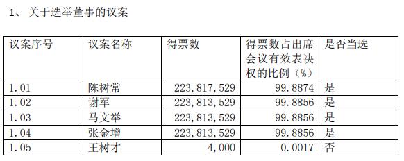 在关于选举董事的议案中,陈树常获得超过22.38亿票,得票数占出席会议有效表决权的比例99.8874%,谢军、马文举、张金增得票数占比均为99.8856%,四人成功当选。王树才得票数仅为4000,占出席会议有效表决权的比例0.0017%,未能当选。