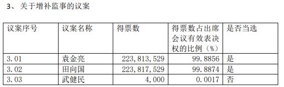 增补监事的投票中,袁金亮、田向国顺利当选,而武健民得票数4000,占出席会议有效表决权的比例0.0017%,未能当选。
