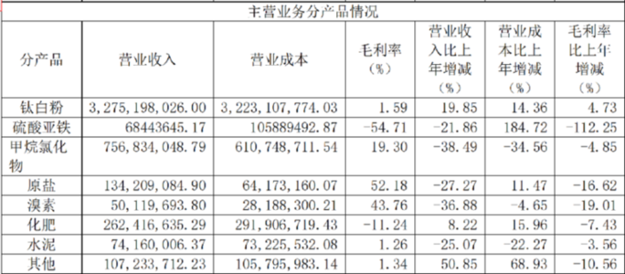 分产品来看,报告期内,钛白粉占公司主营业务收入的69.26%,较上年同期增加19.85%;甲烷氯化物产品占主营业务收入16.01%,较上年同期减少38.49%;化肥占主营业务收入的5.55%,较上年同期增加8.22%;原盐占主营业务收入的2.84%,较上年同期减少27.27%;溴素占主营业务收入的1.06%,较上年同期减少36.88%;水泥占主营业务收入1.57%,较上年同期减少25.07%;其他产品占主营业务收入的2.27%,较上年同期增加50.85%。