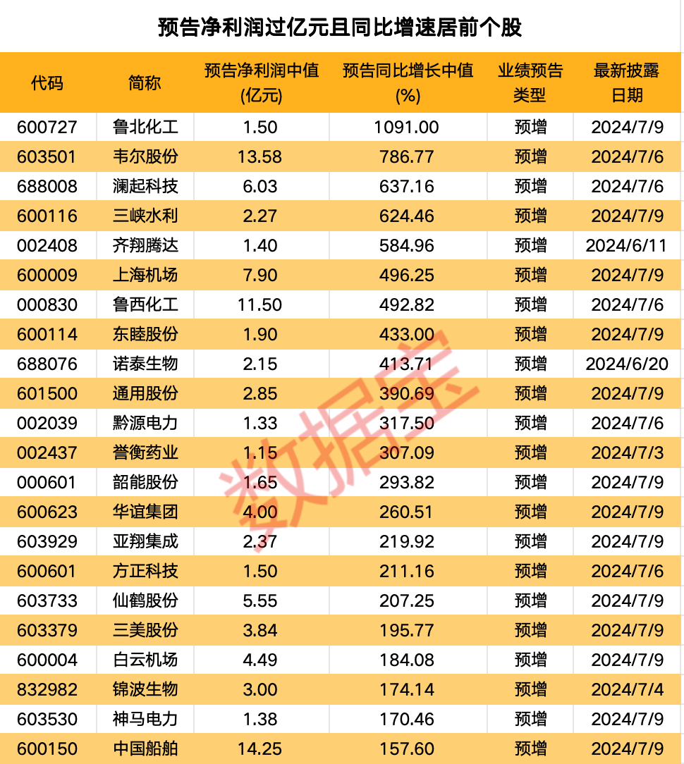 在预告净利润过亿元的个股中,22股同比增长超50%。鲁北化工、韦尔股份、澜起科技、三峡水利和齐翔腾达净利润同比增长居前,依次为1091%、786.77%、637.16%、624.46%、584.96%。