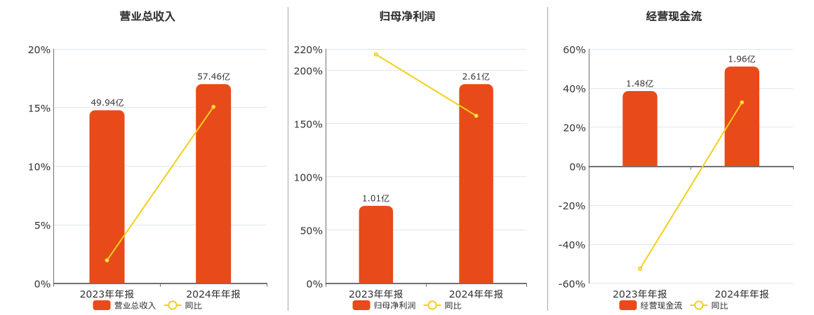 公司营业总收入为57.46亿元,较去年同报告期营业总收入增加7.52亿元,实现5年连续上涨,同比较去年同期上涨15.06%。归母净利润为2.61亿元,较去年同报告期归母净利润增加1.60亿元,实现2年连续上涨,同比较去年同期上涨157.28%。经营活动现金净流入为1.96亿元,较去年同报告期经营活动现金净流入增加4814.56万元,同比较去年同期上涨32.64%。