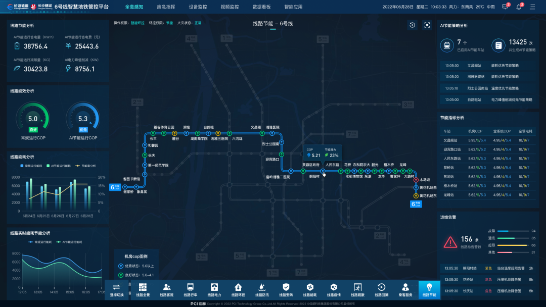 佳都为新建、建成5-10年、15年以上多种场景的车站提供不同的节能解决方案和软硬件产品,目前,佳都节能控制算法已在长沙地铁6号线全线上线,通过中央级平台控制方式,对全线地铁站进行实时的节能控制。长期的数据实测显示,采用了佳都智慧地铁节能控制的空调系统平均节能量为517 kWh/站/日,平均节能率为26.2%,节能效果得到显著优化。