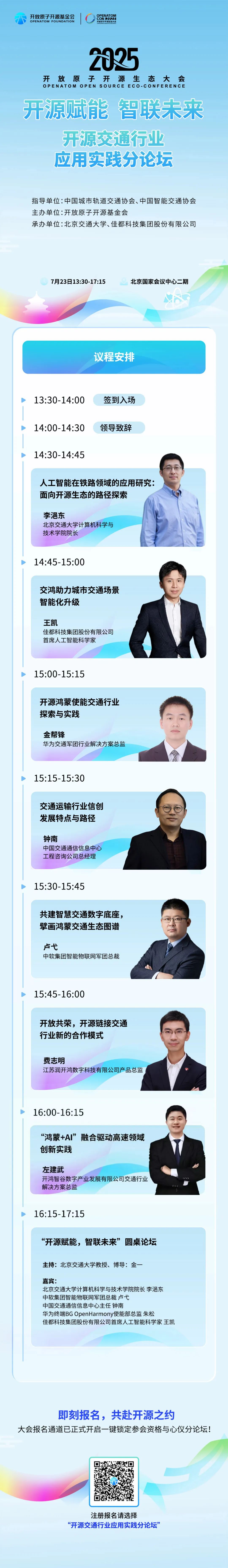 论坛汇聚政府、院士专家、企业、高校及投资机构代表,将围绕开源技术赋能交通行业转型展开深度研讨,集中展示开源技术落地行业创新案例及成果,届时众多行业专家和企业代表将带来精彩的主题演讲,并举办以“开源赋能智联未来”为主题的圆桌论坛,分享业界基于开源技术的创新成果。
