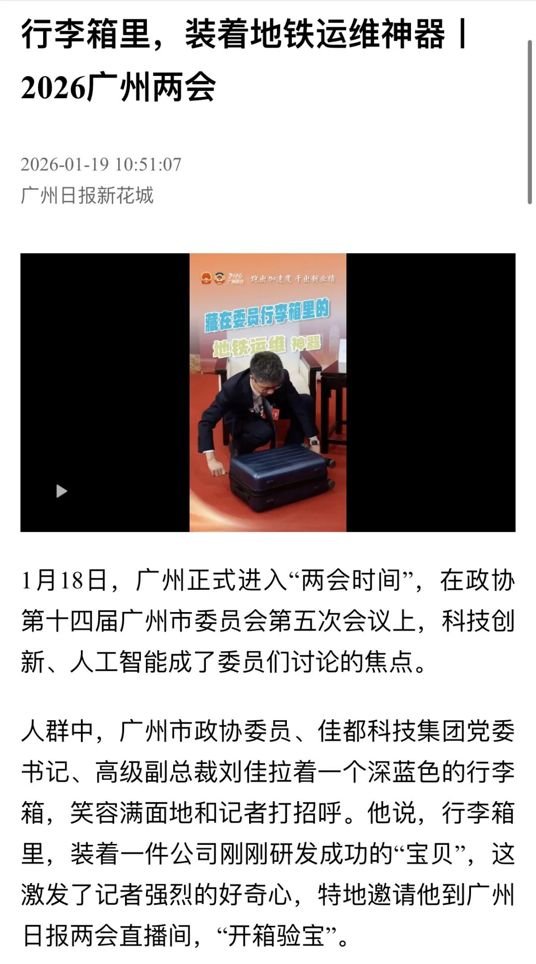 1月18日-20日,政协第十四届广州市委员会第五次会议圆满召开。作为广州民营科技企业代表,广州市政协委员,佳都科技集团党委书记、高级副总裁刘佳携三份提案上会,为推动广州“十五五”开好局起好步、奋力开创现代化建设新局面贡献真知灼见、凝聚发展共识。