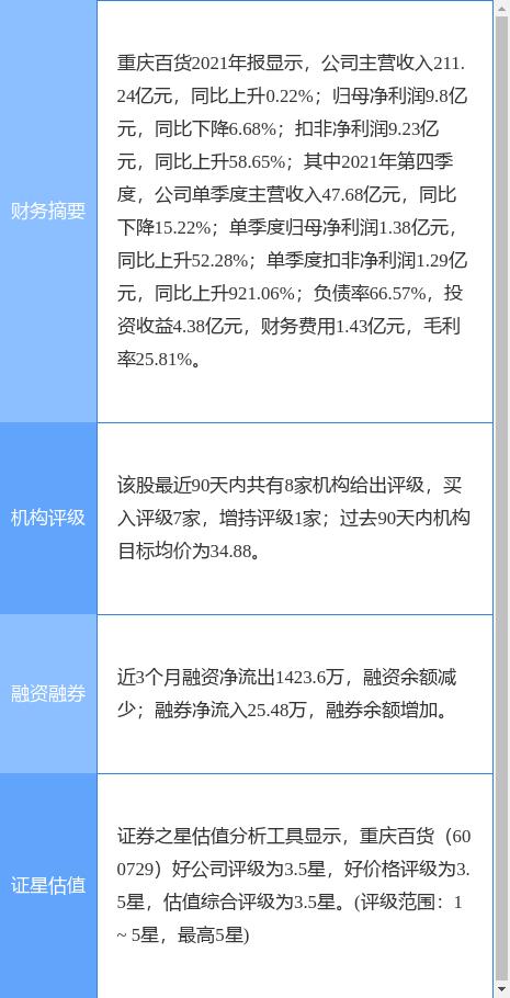 重庆百货发布2022年第一季度报告,实现营业收入52.71亿元,同比下降19.04%;归属于上市公司股东的净利润4.14亿元,同比下降5.03%;归属于上市公司股东的扣除非经常性损益的净利润3.66亿元,同比下降11.35%;基本每股收益1.04元。