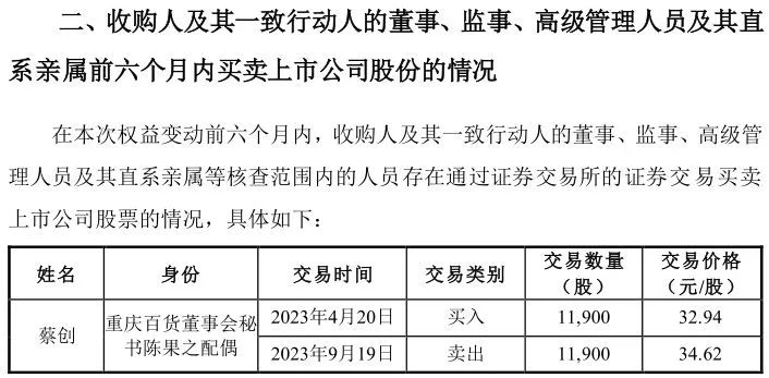 收购人重庆渝富控股集团及一致行动人的董监高及其直系亲属当中,重庆百货董事会秘书陈果的配偶——蔡创在买卖股票。