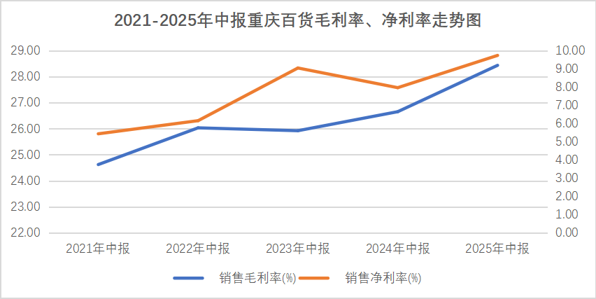 从过去五年来看,重庆百货的盈利能力一直保持整体上升的趋势。下图显示了这段时间毛利率与净利率的走势,可以看出2025年上半年,毛利率呈现出加速上行的趋势。