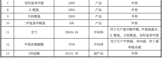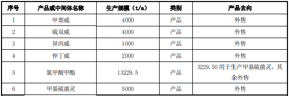 项目建设规模为光气及光化产品生产车间(30000t/a中间体光气生产装置、2000t/a K-酰氯生产装置、500t/a 二甲氨基甲酰氯生产装置、2000t/a 月桂酰氯生产装置、2000t/a 邻羟基苯甲腈生产装置);光化产品生产车间(13229.5t/a 氯甲酸甲酯生产装置和 5000t/a 甲基硫菌灵生产装置);异酯原药生产车间(3700t/a 中间体甲基异氰酸酯生产装置、4000t/a 甲萘威生产装置、1000t/a 异丙威生产装置和 2000t/a 仲丁威生产装置);硫双威生产车间(4307t/a 中间体灭多威和 4000t/a 硫双威生产装置)。