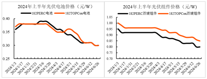 2024年上半年,国内硅料、硅片、电池、组件的产量同比增长皆超过32%,上游制造产能的快速增长显著超过了下游需求端的市场增速,继续加剧供需失衡,企业竞争愈发内卷,销售价格大幅下跌。同时大量中低端、同质化产品集中推向市场,加剧了市场价格持续下降幅度。今年上半年,光伏产业链各环节的市场价格因此延续了去年四季度以来的下跌态势,上半年PERC和TOPCon电池片价格跌幅均超过15%。