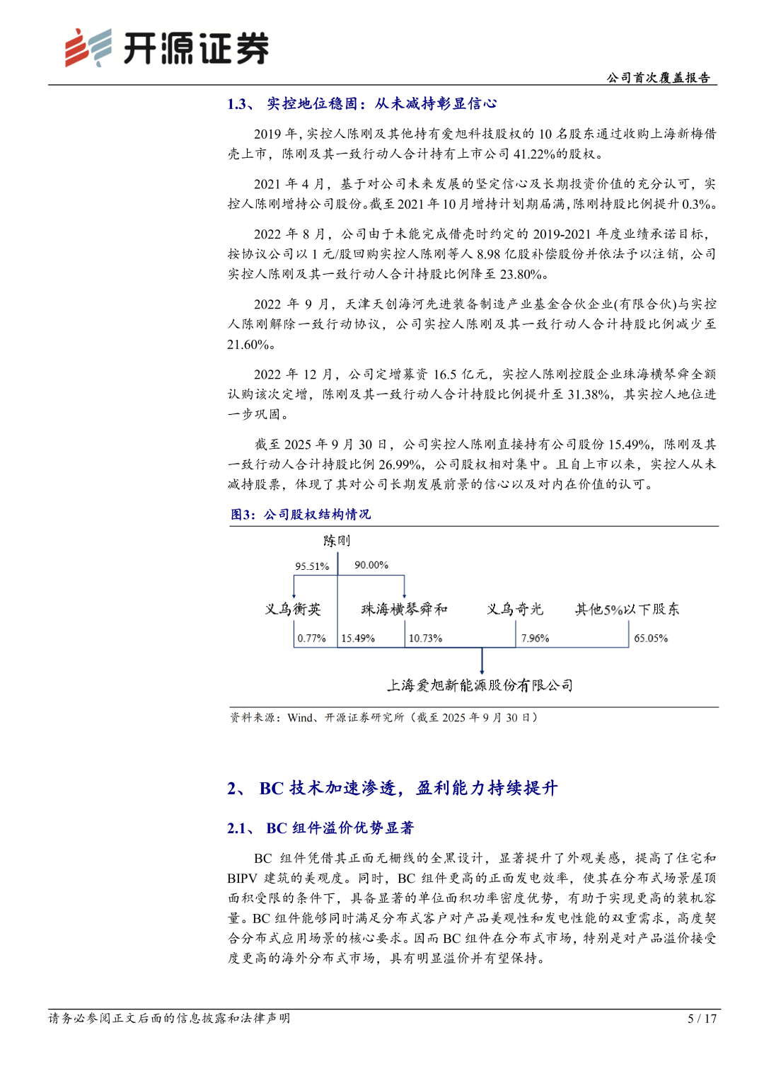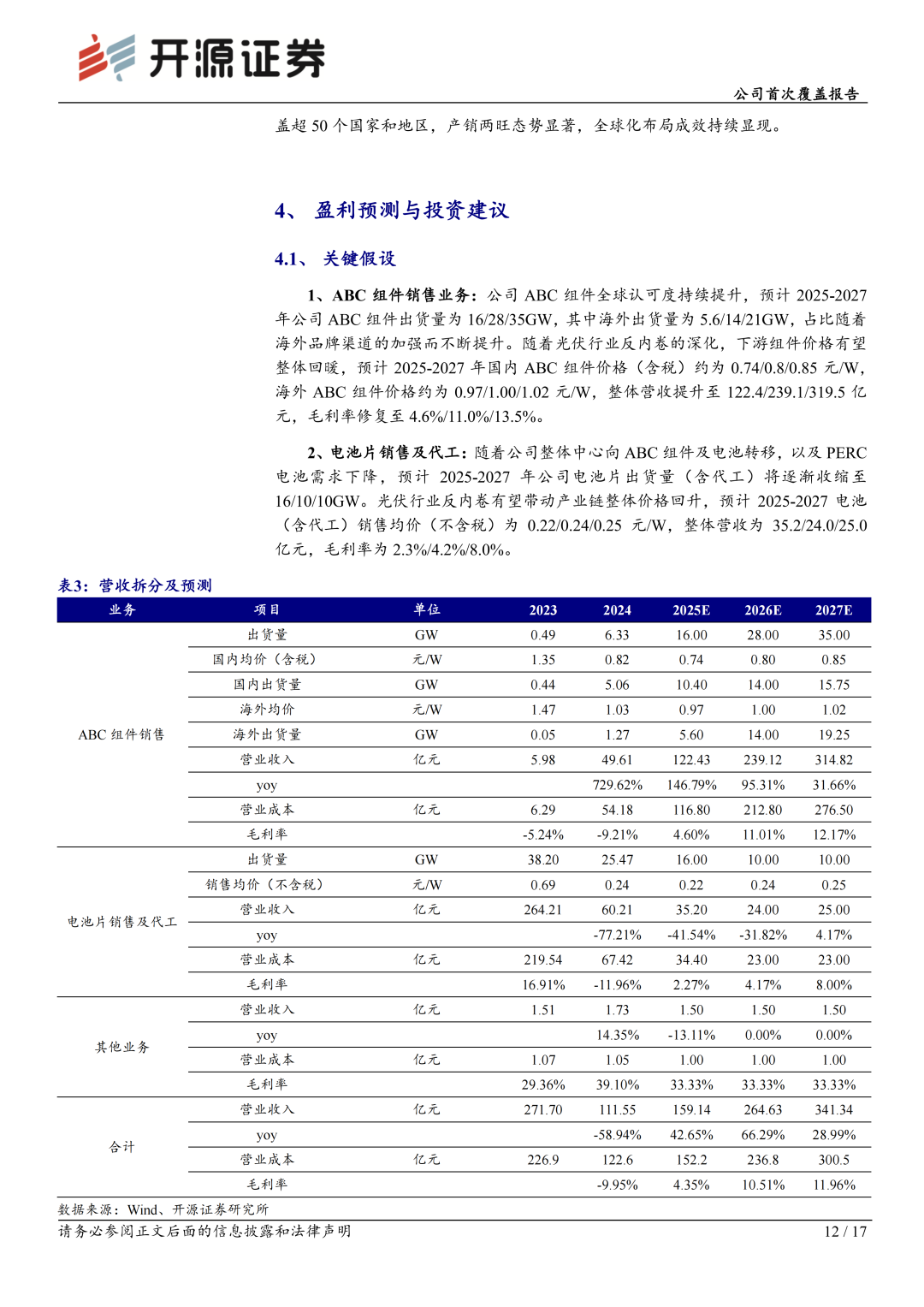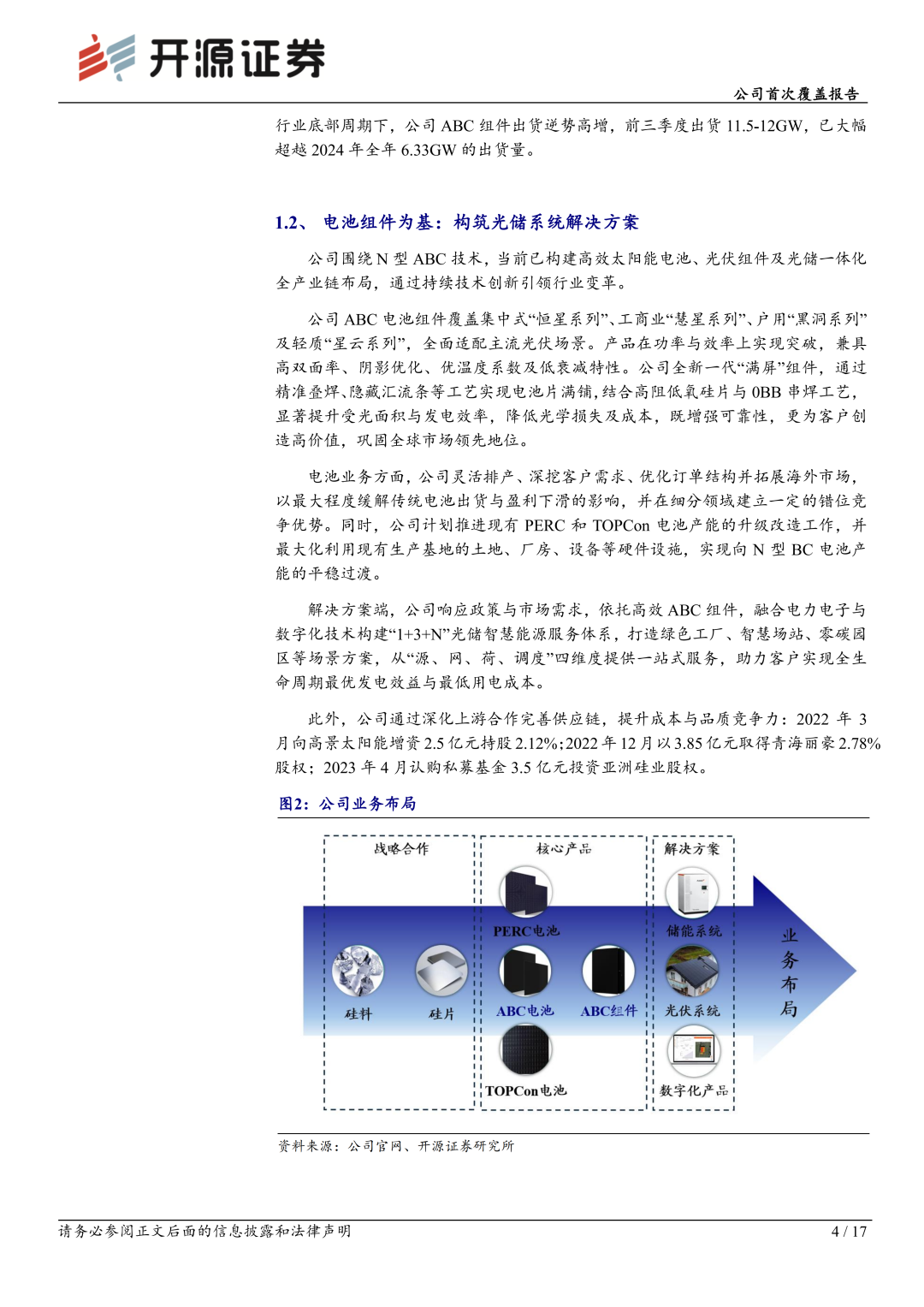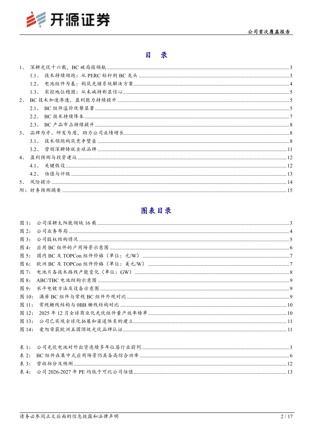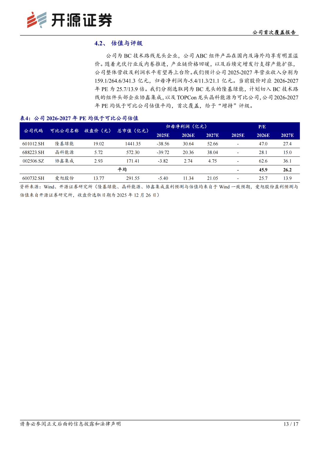 公司深耕太阳能电池领域16载,积淀了深厚的技术壁垒。2021年,公司率先发布ABC技术,并于业内最早实现N型BC的GW级量产。当前,公司专注于光伏发电核心产品的研发与制造,并提供覆盖“光-储-用”一体化的整体解决方案,核心产品包括高效太阳能电池、ABC组件以及多元场景化应用方案。公司ABC组件凭借高功率、高安全、高颜值等优势,市场认可度与影响力迅速提升。我们预计公司2025-2027年归母净利润为-5.4/11.3/21.1亿元,当前股价对应2026-2027年PE为25.7/13.9倍。首次覆盖给予“增持”评级。