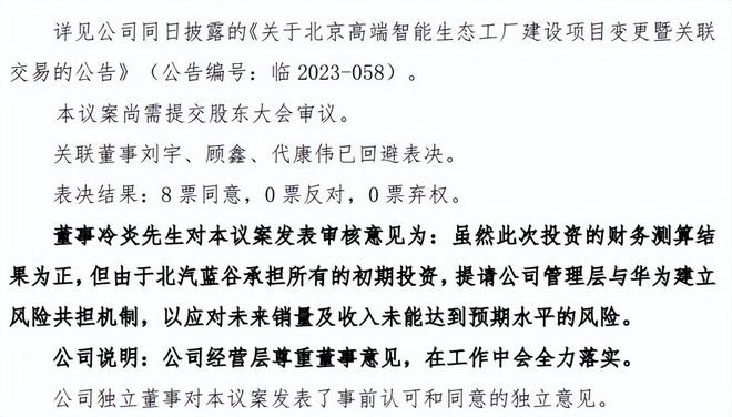 虽然此次投资的财务测算结果为正,但由于北汽蓝谷承担所有的初期投资,提请公司管理层与华为建立风险共担机制,以应对未来销量及收入未能达到预期水平的风险。