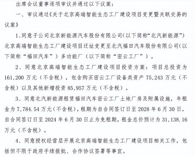 根据2023年8月14日晚间公告,北汽蓝谷子公司北京新能源汽车股份有限公司(下文简称“北汽新能源”)北京高端智能生态工厂建设项目,迁址变更至北汽福田汽车股份有限公司(下文简称“福田汽车”)多功能厂(下文简称“密云工厂”)。