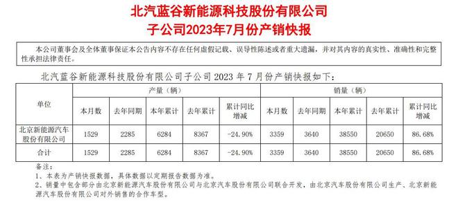 2023年截至7月,北汽蓝谷整个公司的销售,应该说有一定起色。