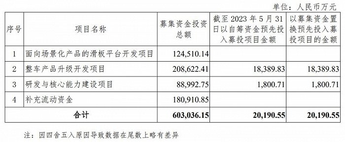 根据募资的使用计划,18.09亿元用于补充流动资金,占募资净额的30%;此外,12.45亿元投资于“面向场景化产品的滑板平台开发项目”,20.86亿元投资于“整车产品升级开发项目”,8.90亿元投资于“研发与核心能力建设项目”。其中,整车产品升级开发项目和研发与核心能力建设项目已经以自筹资金预先投入了2.02亿元。