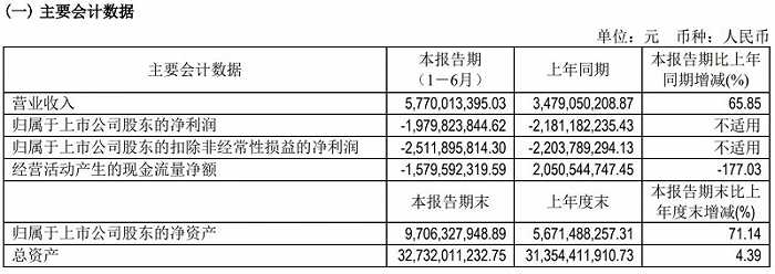 北汽蓝谷(600733.SH)2023年半年度报告显示,上半年实现营业收入57.70亿元,和上年同期相比增长65.85%,不过,实现归属于上市公司股东的净昨润为-19.80亿元,仍然为巨额亏损,但亏损有所收窄;上半年扣非归母净利润为-25.12亿元,和上年同期相比却出现了亏损扩大的情况。