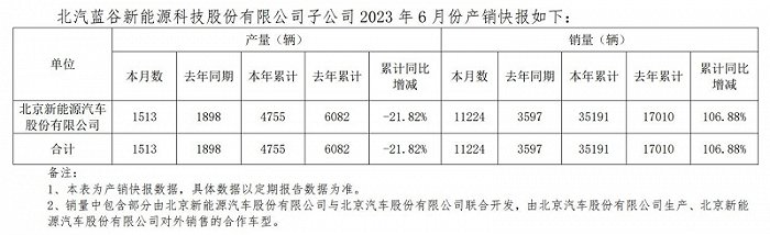 此前,北汽蓝谷于7月3日披露的《子公司2023年6月份产销快报》显示,1至6月的累计产量为4755辆,同比减少21.82%;不过,累计销量不仅远远高于产量,而且也出现了同比大幅增长。仅6月份销量就有11224辆,占上半年累计销量的31.89%,而去年6月的销量为3597辆。