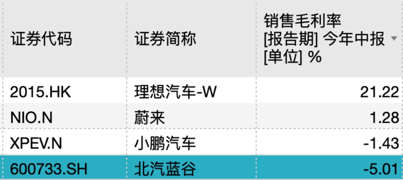 从盈利角度来看,北汽蓝谷则一直在做赔本生意。2020年至2023上半年,公司的毛利率分别为-28.82%、0.81%、-5.20和-5.01%,其中三年都为负。与身处新能源赛道的同行相比,今年上半年理想汽车、蔚来、小鹏汽车的毛利率分别为21.22%、1.28%和-1.43%,均优于北汽蓝谷。
