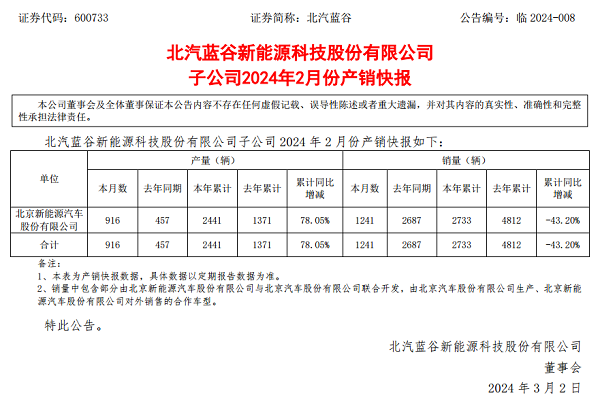 北汽蓝谷2月产销快报