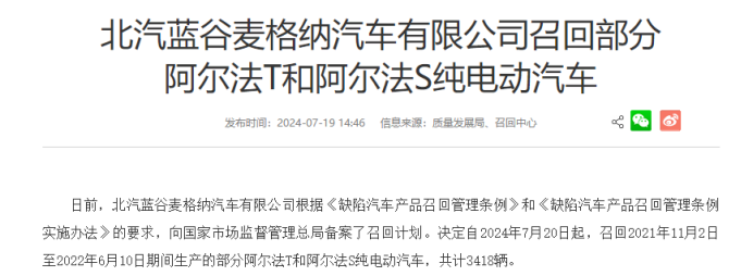 值得一提的是,极狐部分车型近日还因质量问题被召回。蓝谷麦格纳向国家市场监督管理总局备案了召回计划,决定自2024年7月20日起,召回2021年11月2日至2022年6月10日期间生产的部分阿尔法T和阿尔法S纯电动汽车,共计3418辆。