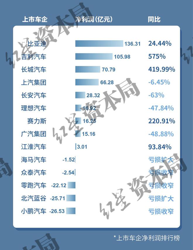其中,比亚迪(002594.SZ)在一众车企中表现亮眼,营收、净利均排名第一,净利润达到136.31亿元。吉利汽车(00175.HK)净利润增速最快,同比增长575%至105.98亿元,同时也是净利润排名第二的车企。除了这两家,其余车企的净利润均未超过100亿元。共有5家车企的净利润超过20亿元。