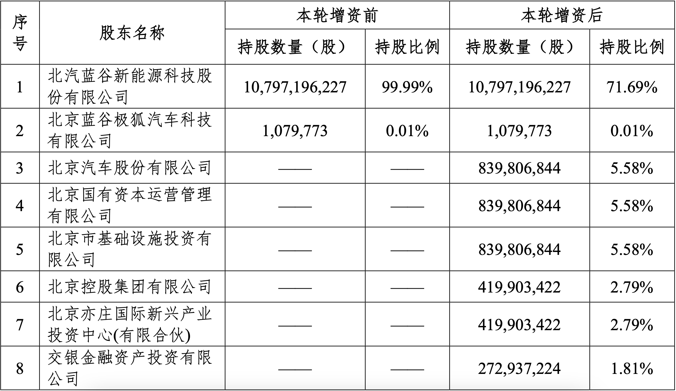 北汽蓝谷称,本轮增资完成后,北汽蓝谷仍为北汽新能源的控股股东。本轮融资后,北汽蓝谷在北汽新能源的持股比例由99.99%降至71.69%。