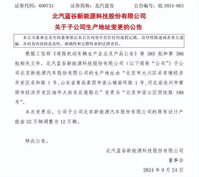 另一方面,贝多财经注意到北汽蓝谷已在2024年9月变更了北汽新能源的生产地址,原有设计产能也由32万辆下调至12万辆。此前“长江商报”曾报道称,该公司的产能利用率仅为11.3%,闲置产能高达20.84万辆。
