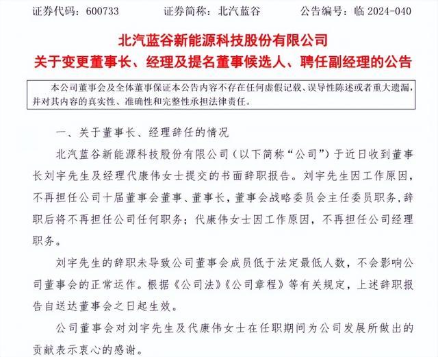 而2024年7月,北汽蓝谷曾发布公告称,刘宇因工作原因不再担任该公司董事、董事长等职务,董事会同意选举原经理代康伟接棒董事长一职,张国富、刘观桥则将填补经理、副经理之位。