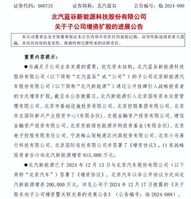 2024年年末,北汽蓝谷又发布公告称,其子公司北汽新能源已完成增资扩股。其中11家外部战略投资者合计将向北汽新能源增资81.5亿元,北京汽车则将以非公开协议方式增资20亿元,北汽新能源共计可收到增资101.5亿元。