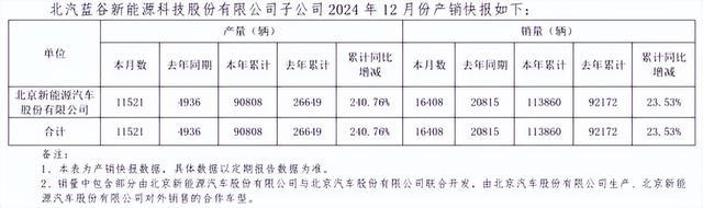 2025年的第一个工作日,北汽蓝谷新能源科技股份有限公司(SH:600733,简称“北汽蓝谷”)对外披露了子公司北京新能源汽车股份有限公司(下称“北汽新能源”)2024年12月份的产销快报。