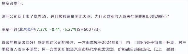 销售转化率较低的问题引起了诸多投资者的关注,北汽蓝谷解释称,一方面享界于2024年8月上市,目前仍处于销量上升期,对三季报收入影响不明显;另一方面新能源汽车市场竞争愈发激烈,价格战日趋白热化,进而影响收入。