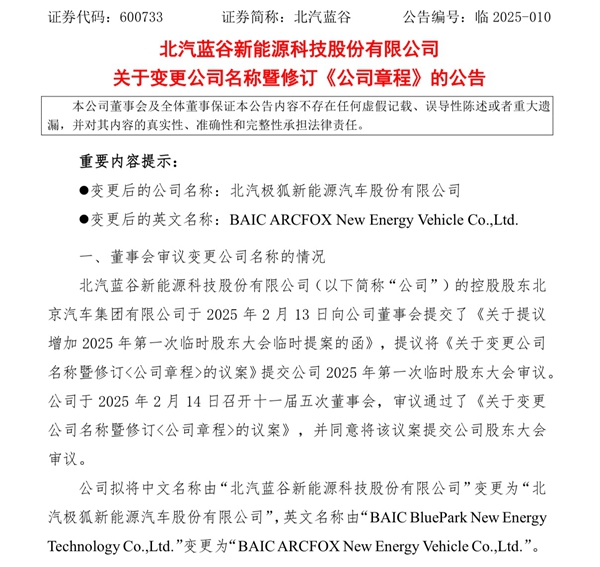 北汽蓝谷近日发布公告称,公司于2025年2月14日召开十一届五次董事会,审议通过了《关于变更公司名称暨修订的议案》,并同意将该议案提交公司股东大会审议。公司拟将中文名称由“北汽蓝谷新能源科技股份有限公司”变更为“北汽极狐新能源汽车股份有限公司”。