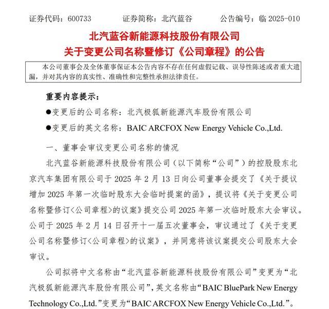 日前,北汽蓝谷发布公告称,公司拟将中文名称由“北汽蓝谷新能源科技股份有限公司”变更为“北汽极狐新能源汽车股份有限公司”。官方给出的解释是:“旨在进一步聚焦新能源汽车主业,提升品牌在市场中的辨识度和影响力,契合公司未来发展方向。”