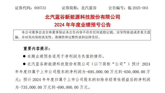 早在过年前,北汽蓝谷就发布了年度业绩预亏公告。2024年预计归母净利润亏损65亿至69.5亿元,扣非净利润亏损69亿至73.5亿元。这是北汽蓝谷自2020年以来的连续五年亏损,累计亏损将近300亿元。