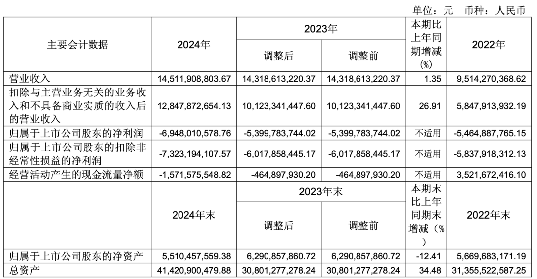 2024年,北汽蓝谷亏损扩大,且亏损规模创新高,净亏损69.48亿元,营业收入145.12亿元,同比增长1.35%。实现经营活动现金流量净额-15.72亿元,比上年同比减少238.05%。
