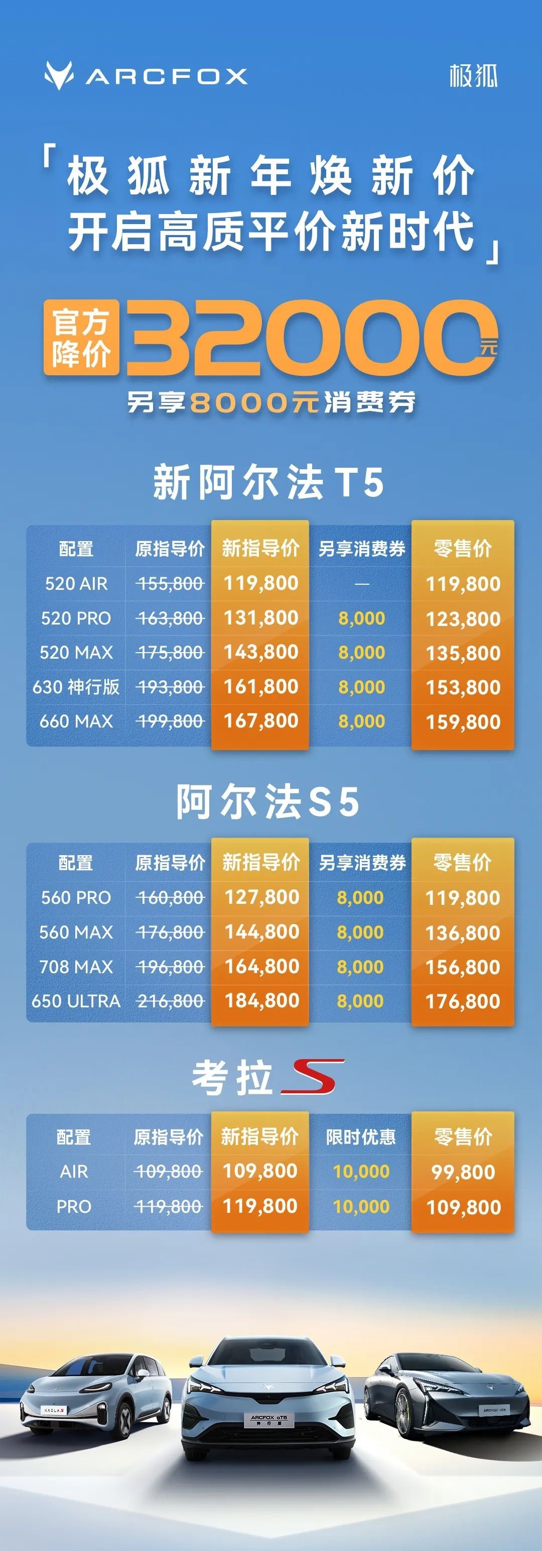 今年2月起,极狐品牌旗下阿尔法、考拉等多款车型纷纷下调价格,叠加8000元的消费券,最高下调了4.1万元。