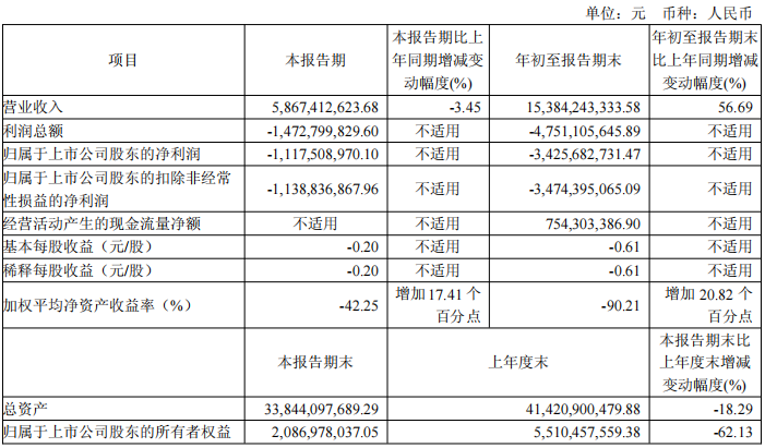 从年初至报告期末(2025年1-9月)来看,公司累计实现营业收入15,384,243,333.58元,同比大幅增长56.69%;归属于上市公司股东的净利润为-3,425,682,731.47元,归属于上市公司股东的扣除非经常性损益的净利润为-3,474,395,065.09元;经营活动产生的现金流量净额为754,303,386.90元;基本每股收益与稀释每股收益均为-0.61元/股;加权平均净资产收益率为-90.21%,较上年同期增加20.82个百分点。