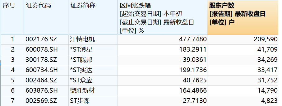 Wind数据显示,截至最新收盘日,这7家公司的股东户数共计37.03万户,江特电机的股东户数最多,达20.95万户。