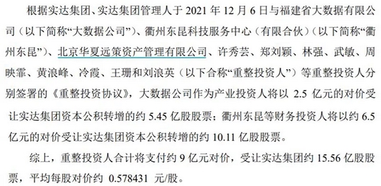 果然,16日晚的回复函信息量惊人。回复函显示,福建省国资企业福建大数据作为产业投资人以2.5亿元的对价受让5.45亿股票,约0.46元/股,9名自然人和2家机构作为财务投资人以约6.5亿元的对价受让10.11亿股股票,约0.64元/股,重整投资人合计支付约9亿元对价受让约15.56亿股股票,约0.58元/股。