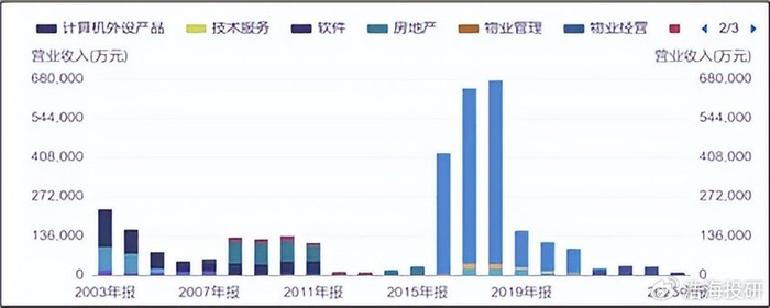 历史数据来看,2000年之后,实达的营收规模开始走下坡路。面对激烈的同业竞争,实达开始尝试多元化转型,先后涉足通讯终端和物联网安防等多个领域,甚至还一度涉足房地产、物业管理和贸易等业务。但因业务布局分散且各板块间缺乏协同效应,不仅未能带来新的业务增长,再加上原业务在激烈的竞争中被“拍在沙滩上”,公司收入规模一年不如一年。2015年,公司收入仅剩3亿元,仅为巅峰年份(2000年总收入32.02亿元)的零头儿。
