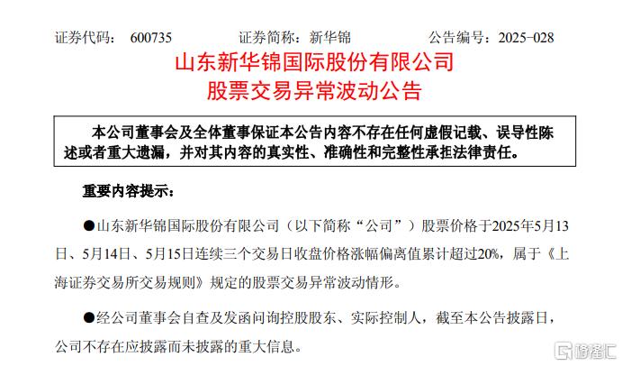 但狂欢背后,风险也在悄然逼近。5月15日晚,新华锦发布股票交易异常波动公告。根据公告内容,新华锦股票在2025年5月13日、14日、15日连续三个交易日收盘价格涨幅偏离值累计超20%,触及《上海证券交易所交易规则》规定的异常波动情形。