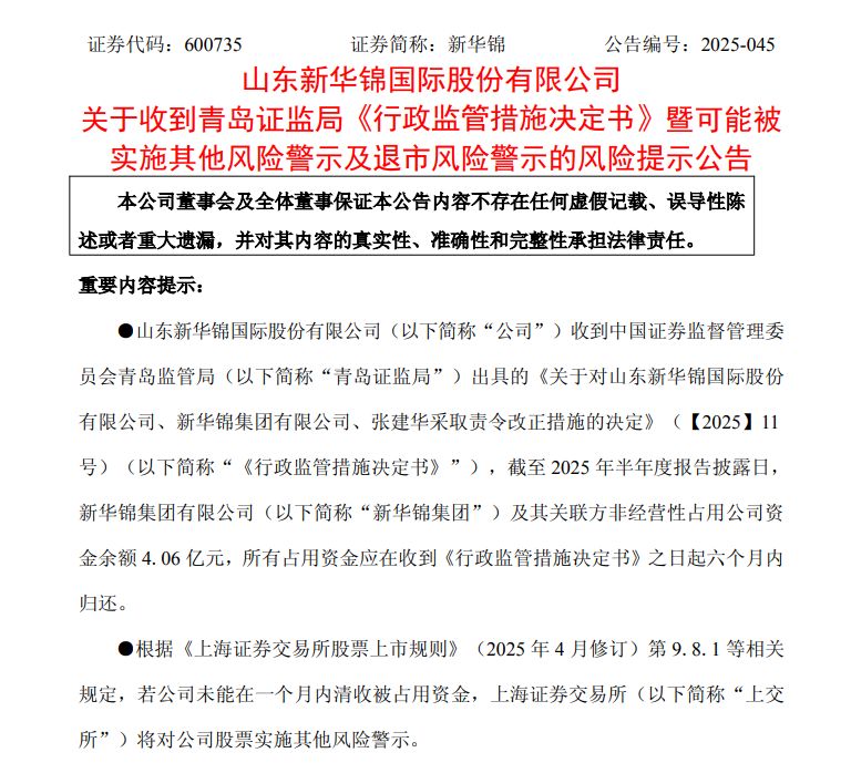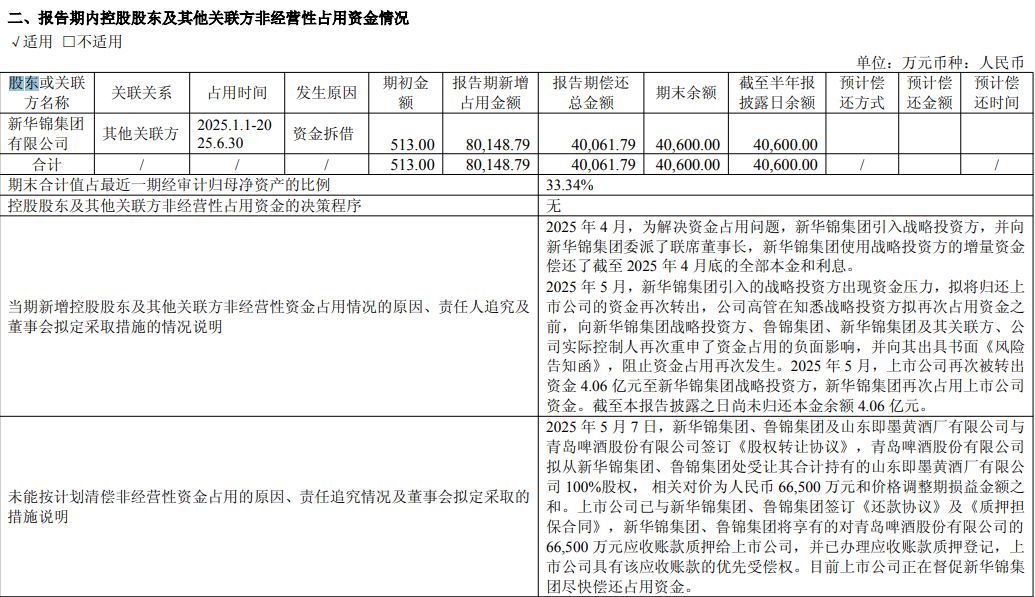 从公告来看,新华锦集团及其关联方非经营性占用上市公司资金,占用时间为2025年1月1日到2025年6月30日;但如今,截至2025年半年度报告披露日,占用资金余额仍有4.06亿元未还。