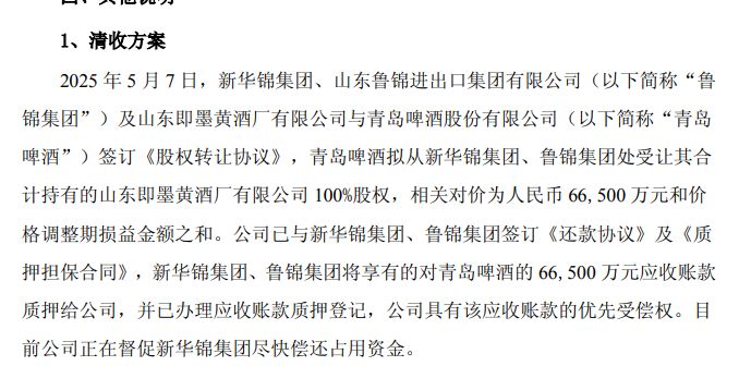 《每日经济新闻·将进酒》记者注意到,对于资金占用归还问题,资金占用方新华锦集团及其关联方欲用即墨黄酒6.65亿元的“卖身钱”还款,目前这笔“应收账款”已被质押,上市公司拥有该应收账款的优先受偿权。