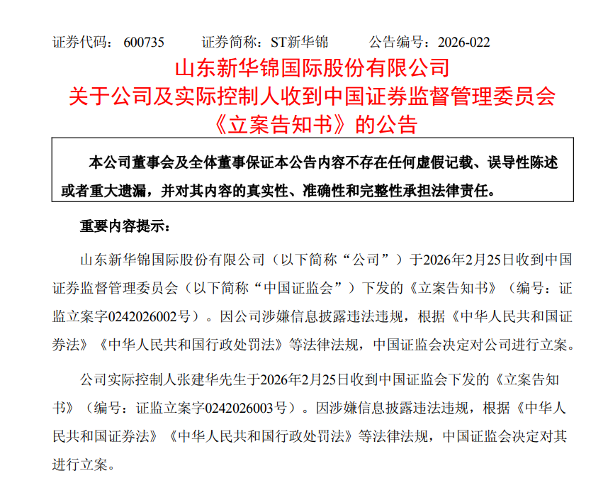 2月25日,山东新华锦国际股份有限公司(证券简称:ST新华锦)公告,收到中国证监会下发的《立案告知书》,因公司涉嫌信息披露违法违规,中国证监会决定对公司及实控人张建华进行立案。