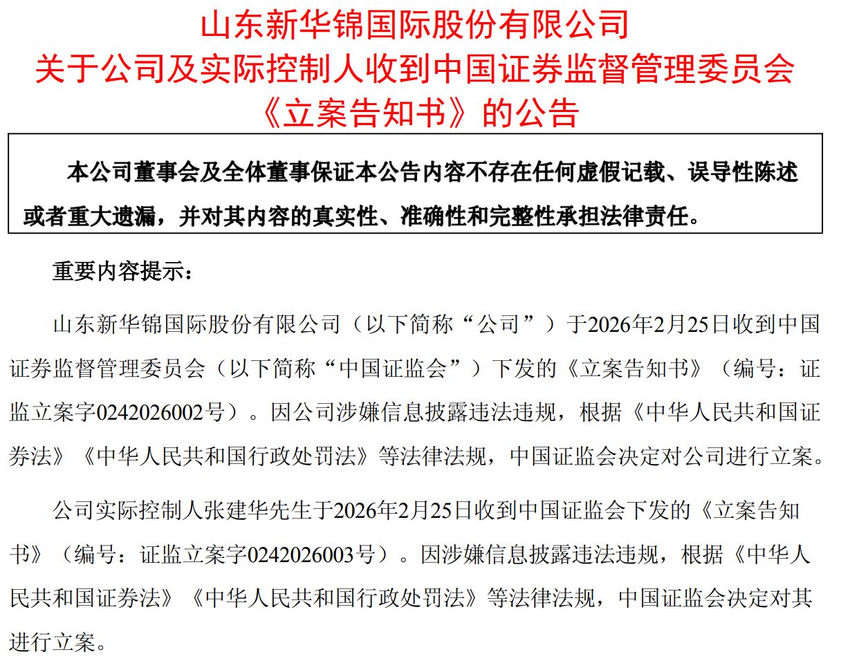 2月25日晚间,ST新华锦集中披露两份公告:一方面,因控股股东及其关联方高达4.06亿元的非经营性资金占用未能在责令改正期限内完成整改,ST新华锦股票自2月26日开市起停牌;另一方面,公司及实际控制人张建华同日收到中国证监会下发的《立案告知书》,因涉嫌信息披露违法违规被双双立案调查。