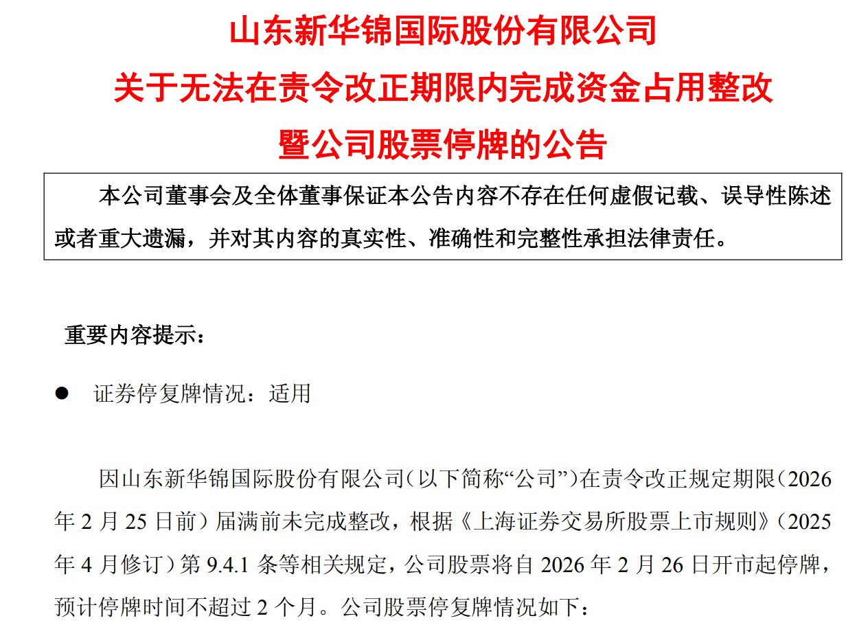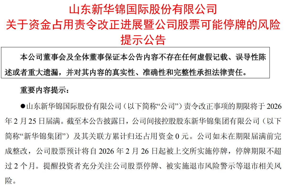 同时,因公司在责令改正规定期限届满前未完成整改,根据上交所相关规定,ST新华锦股票将自2026年2月26日开市起停牌,预计停牌时间不超过两个月。若停牌后两个月内仍未完成整改的,上交所将对公司股票实施退市风险警示;此后两个月内仍未完成整改的,上交所将决定终止公司股票上市交易。