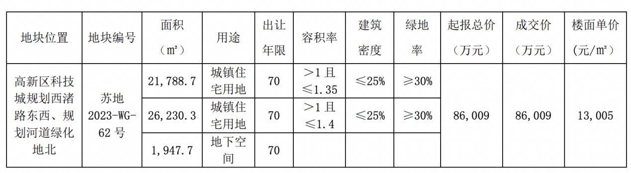 公告显示,2023年10月18日,苏州高新控股孙公司苏州新军捷置地有限公司(以下简称“新军捷”)通过市场竞拍方式取得江苏省苏州市苏地2023-WG-62号宗地土地使用权。竞得宗地的具体情况如下: