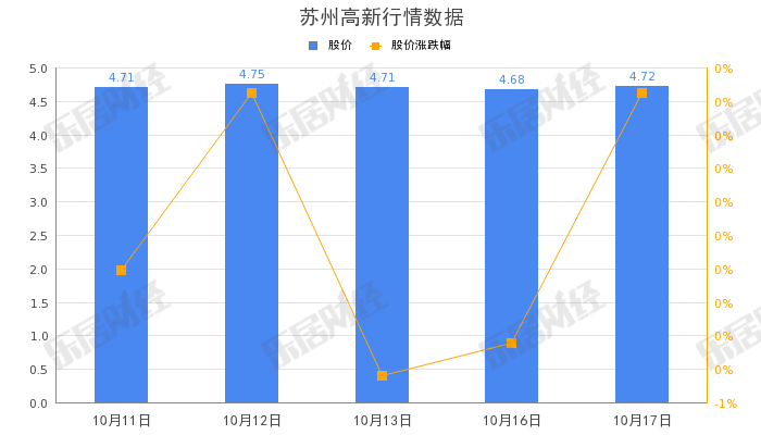 截至10月17日,苏州高新(600736.SH)股价收盘4.68元,涨0.85%,成交总额3,370.10万元,总市值54.34亿元。