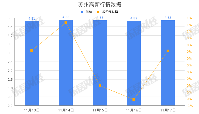 截至11月17日,苏州高新(600736.SH)股价收盘报4.82元,涨0.62%,总市值55.84亿元。