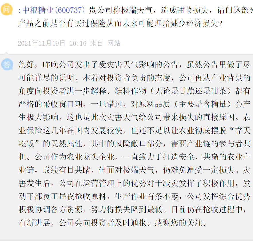 有投资者问,损失这样大为什么没有及时公告?公司回复称,此次极端天气使公司所属多家制糖公司遭受灾害,需组织人员快速抢收原料,也需时间统计各个公司的受损情况,确定损失金额。